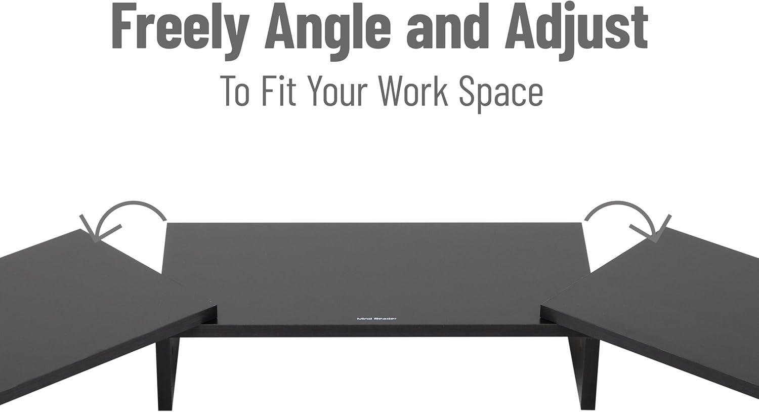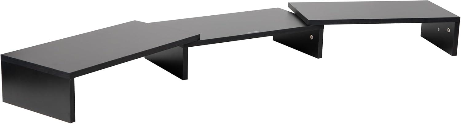 Enhance your workspace ergonomics with this adjustable width monitor riser, designed to lessen eye and back strain by elevating your monitor or laptop to an optimal viewing level. The riser offers versatility with its flexible configurations, giving you the freedom to extend either side up to 36 inches or leave them unextended to suit different spatial arrangements.