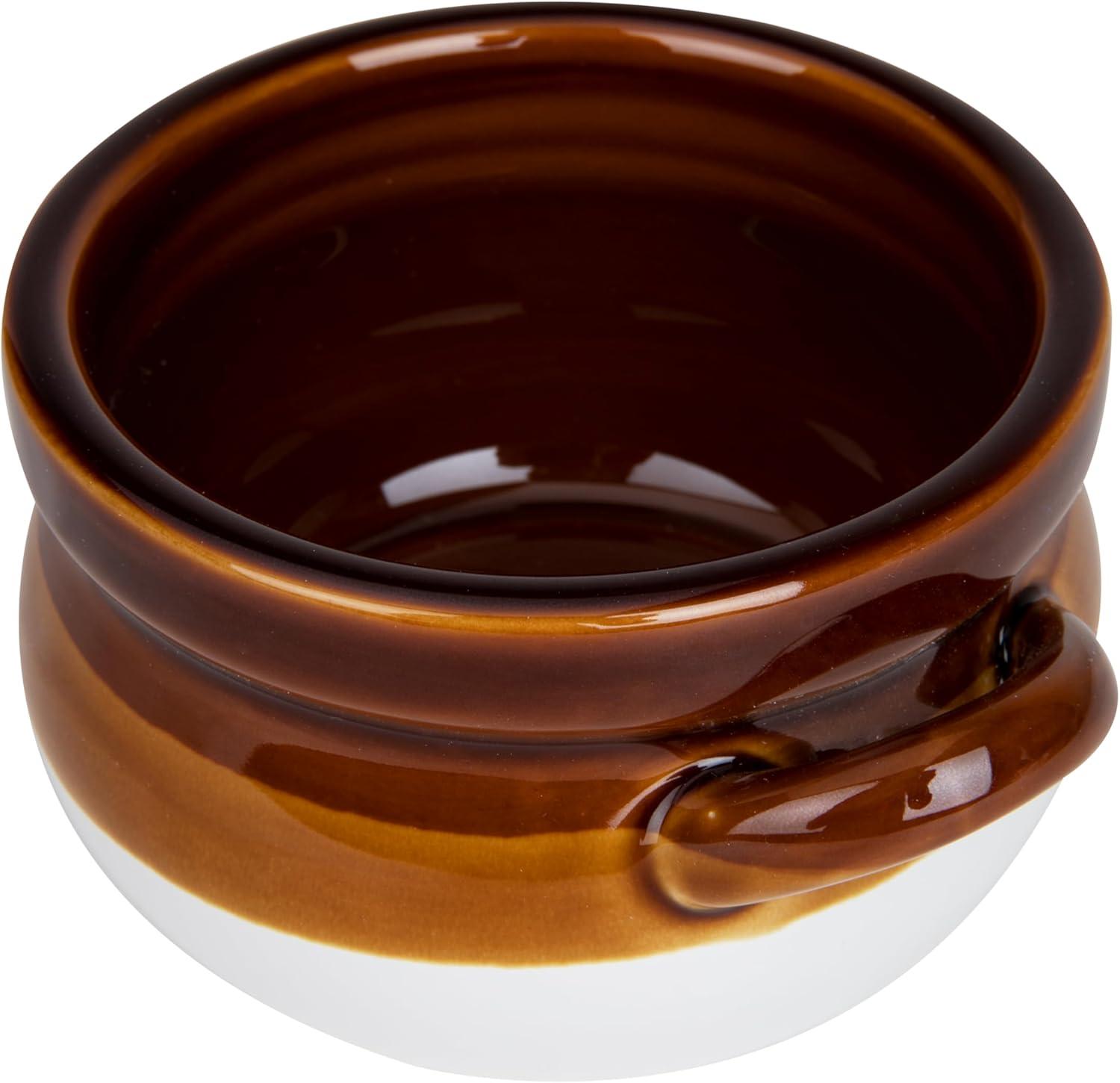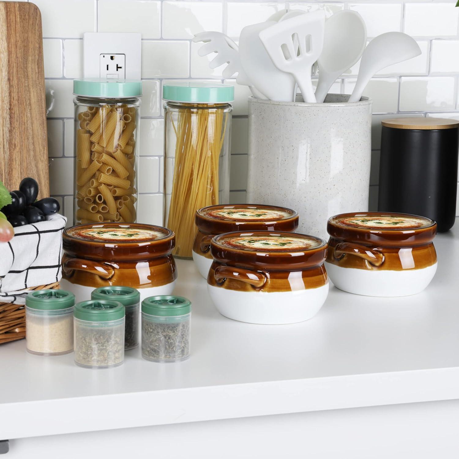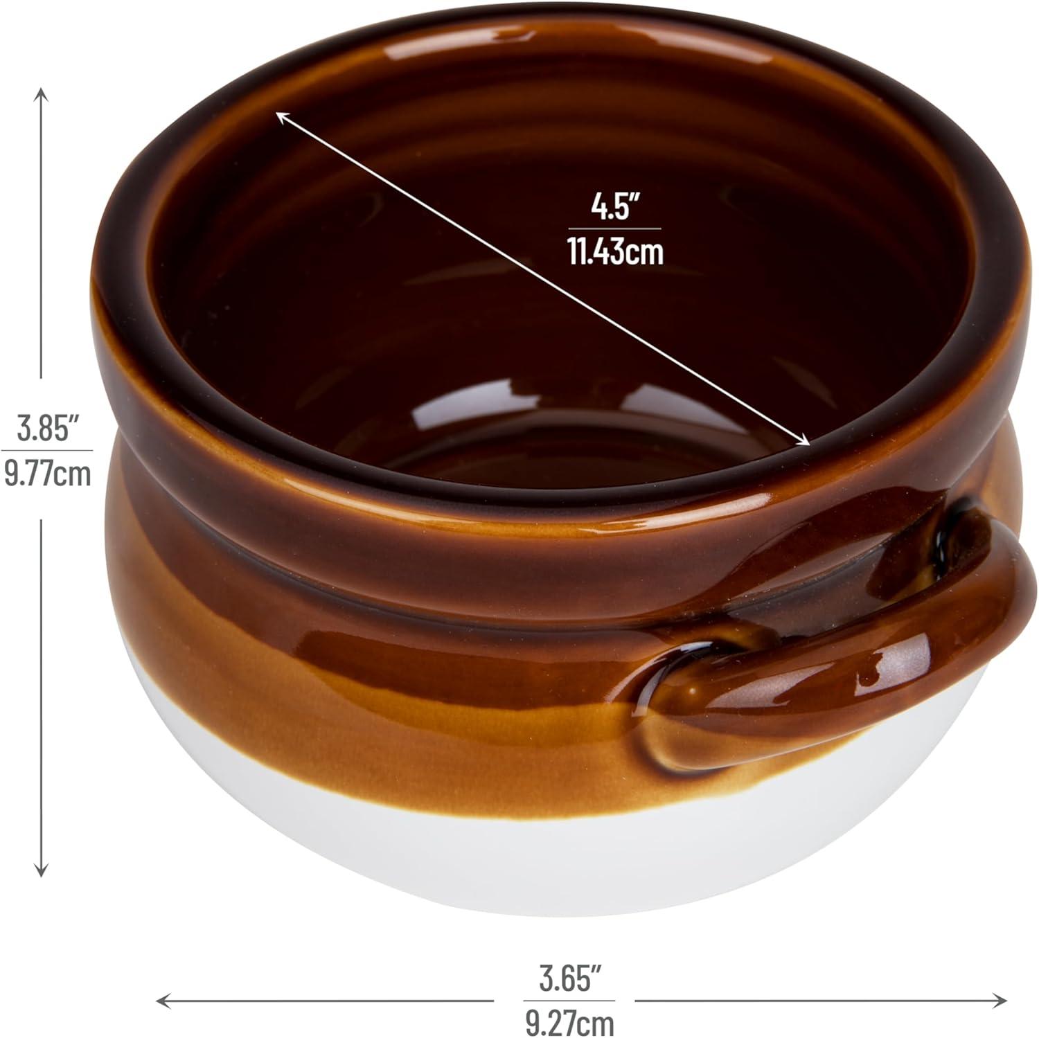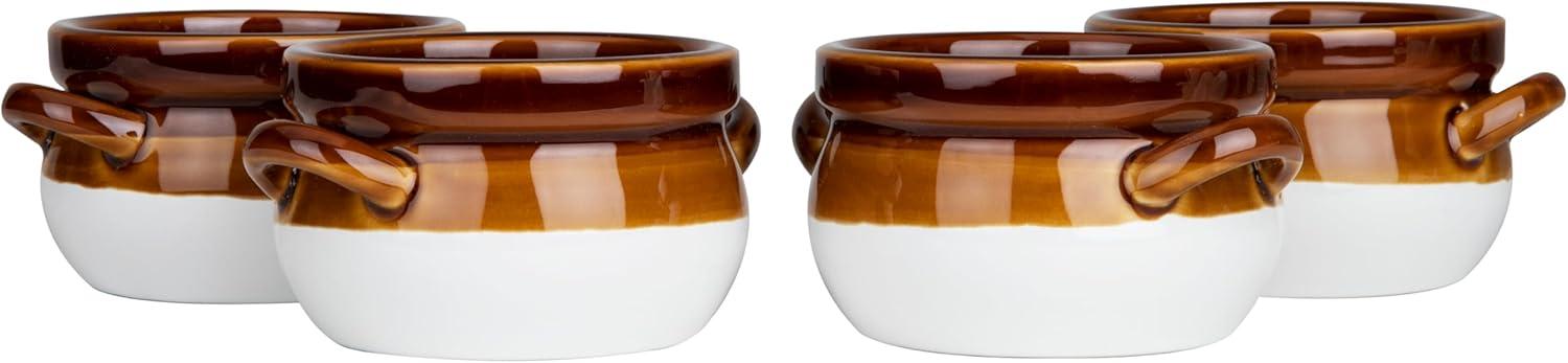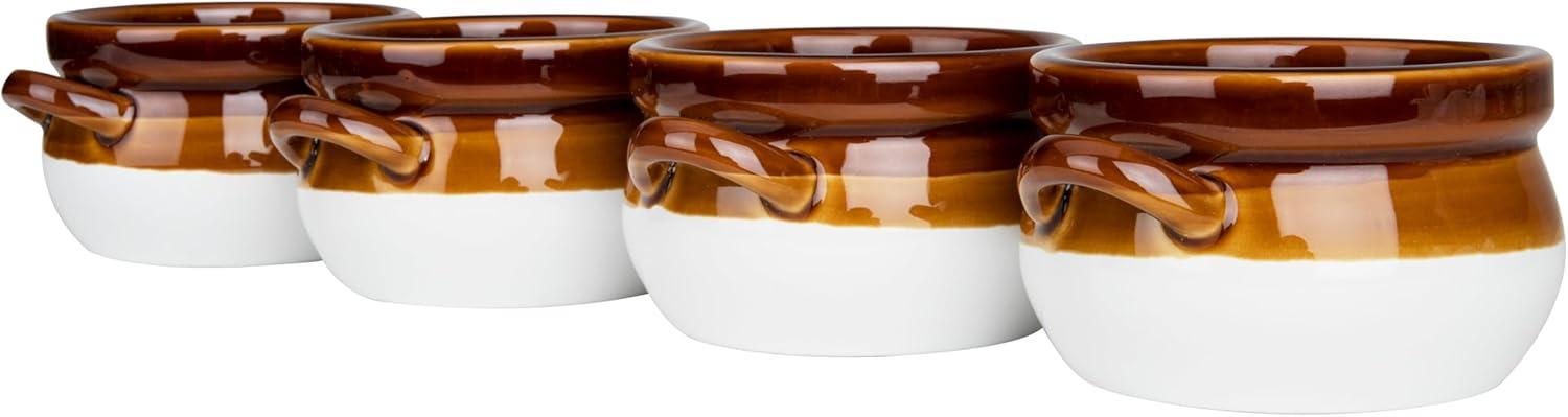 Warm up your kitchen with this cozy crock set of four, featuring four ceramic soup crocks with handles. With its warm brown and white color scheme, this set adds a touch of authenticity to any kitchen, while its multifunctional design makes it a powerhouse for kitchen dinnerware. The crocks are perfect for serving family and guests, and their versatile design allows them to hold everything from onion soup to chili, hot dips, ice cream, fruits, granola, and more.