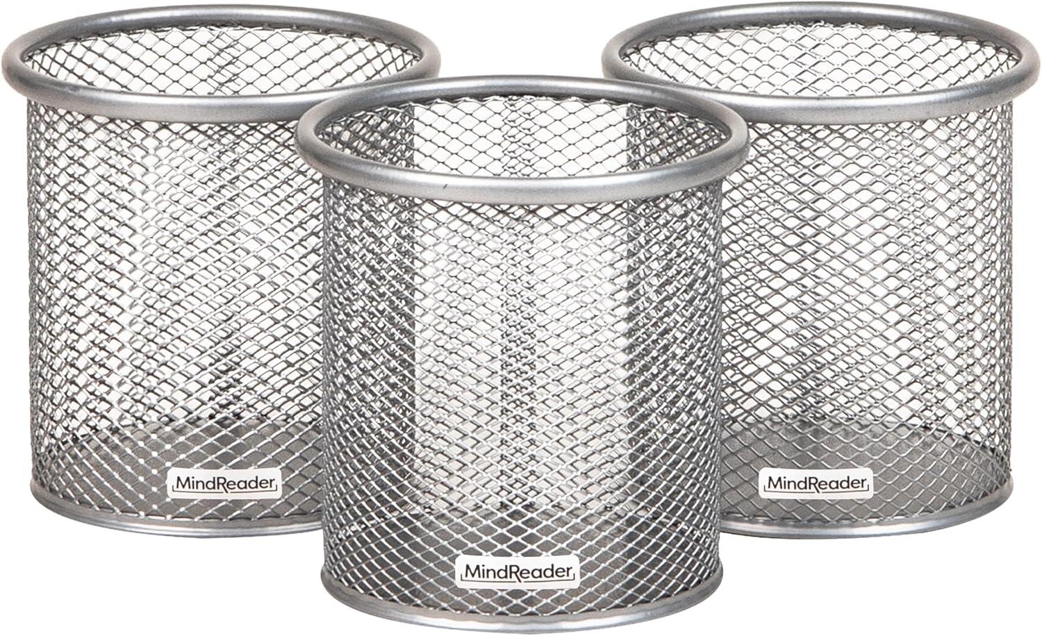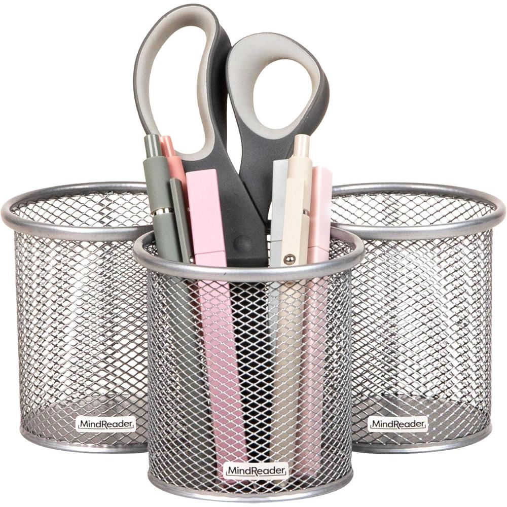 Mind Reader Pen and Accessories Holder, Desktop Organizer, Office, Metal , 3″ L x 3″ W x 4″ H, Set of 3, Gold(Silver)