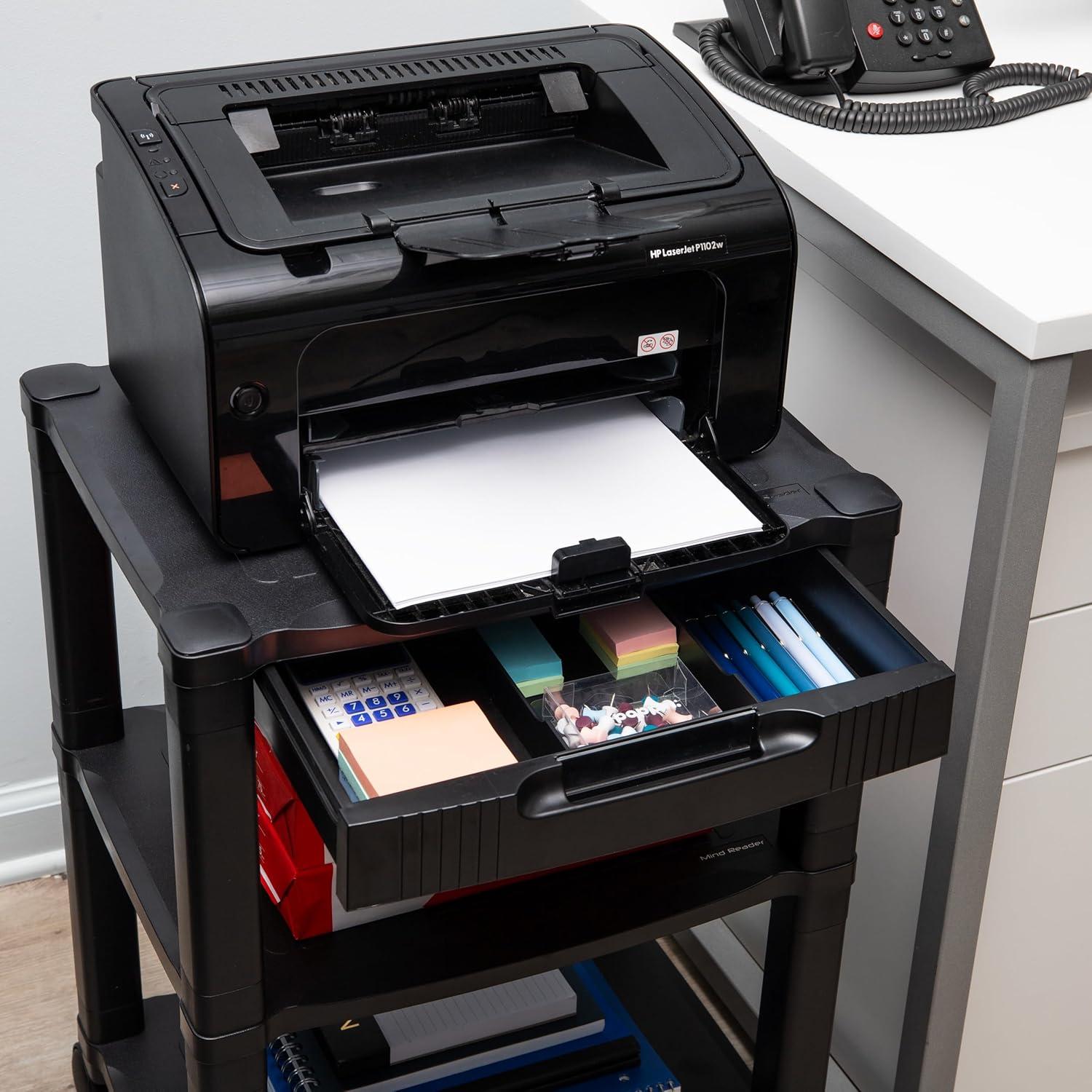 The top tier of the cart includes a drawer for holding smaller items such as pens, markers, clips, ink, and other work essentials. The printer cart drawer has compartment spacers that keep items separate and securely in place.