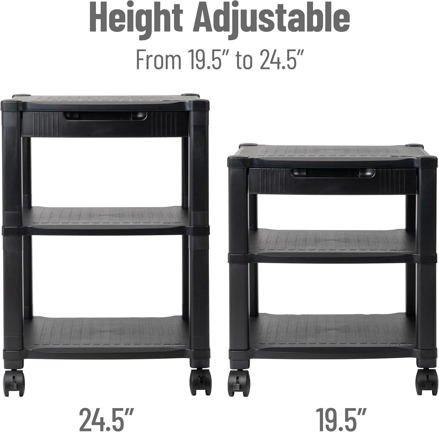 This printer cart is height-adjustable from 19.5 to 24.5 inches, so you can customize the printer shelves to give you room right where you need it the most. Collapse the three-tier cart into two tiers so you can easily hold smaller items. The shorter height lets you simply tuck it away under a desk or table to clear floor space. Use part of the stand on your desktop to keep items organized. This printer stand also includes a cord management system that keeps dangling cords off the floor for extra safety and organization.