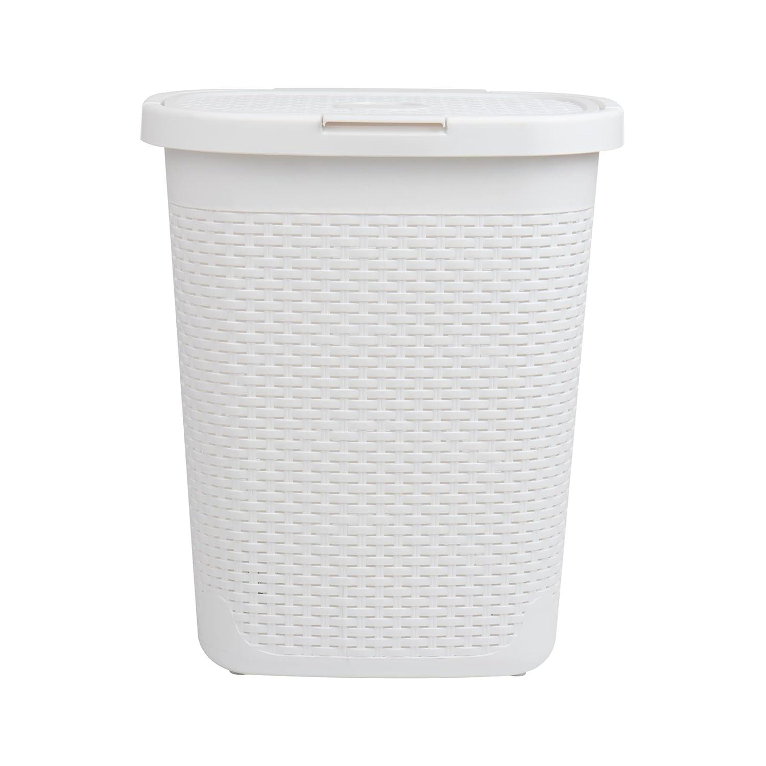The ventilated plastic wicker design promotes airflow while keeping your laundry discreetly covered with a snap-on hinged lid. Lightweight yet durable, this hamper features built-in cut-out handles for easy lifting and transport. Use it not only for laundry but also for storing toys, seasonal clothing, or sports gear. Easy to clean and quick to assemble, this hamper blends practicality with clean, modern design.