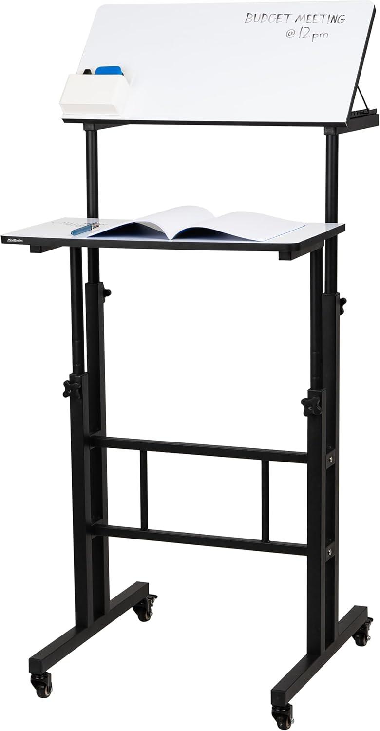 Mind Reader Standing Whiteboard Desk, Adjustable Height, Computer Desk, Laptop Desk, Portable, Rolling, 21″ L x 21.5″ W x 68.5″ H, White