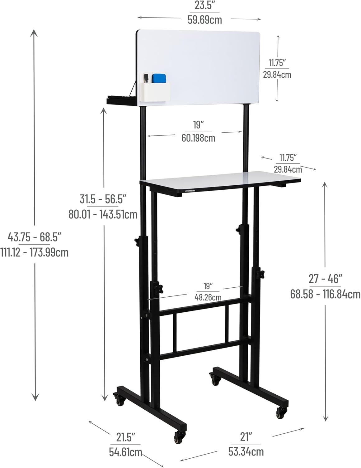 Dimensions: This mobile desk measures 21 long x 21.5 wide x 43.75-68.5 inches tall (53.34 x 54.61 x 111.12-173.99 cm)
